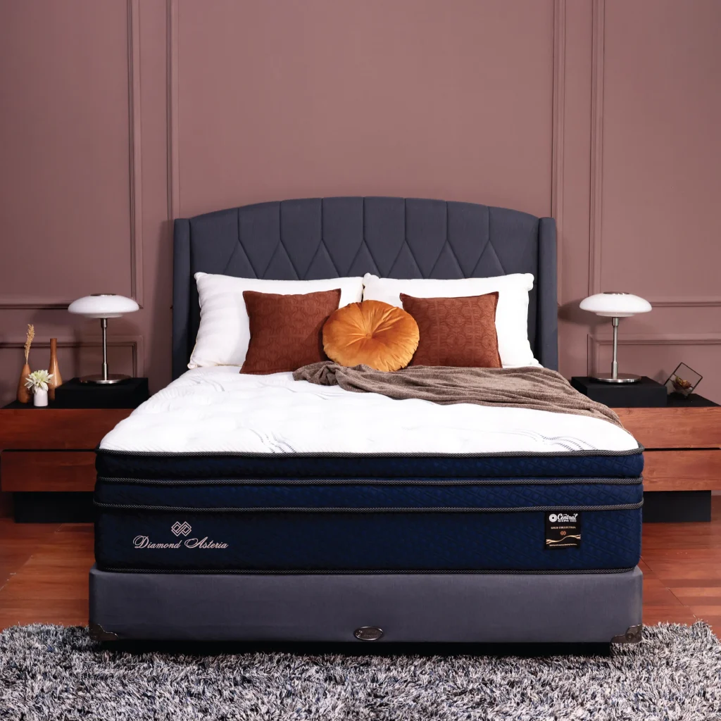 Kasur ini dilengkapi dengan Plush Pillow Top untuk memberikan nuansa tidur yang mewah, menggunakan pegas 3 Zone Pocket Spring, serta dilapisi Blue Gel Memory Foam dan Natural Latex. Encasement Foam-nya memberikan dukungan maksimal bahkan di bagian tepi kasur. Kasur ini juga menggunakan cover kain 3D knitted fabric yang didesain 3D dan terasa sejuk saat bersentuhan dengan kulit.