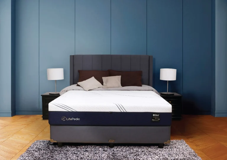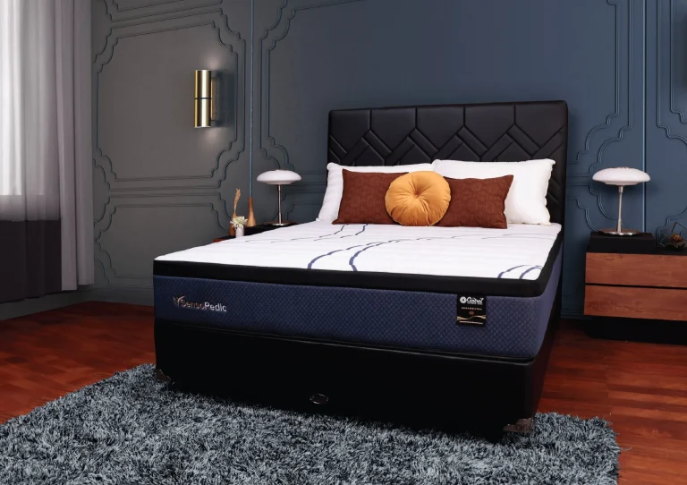 Kasur empuk dengan Plush Pillow Top, lapisan blue gel memory foam, natural latex dengan keliling encasement foam serta cover 3D Knitted Fabric